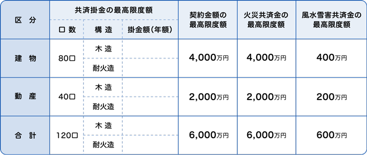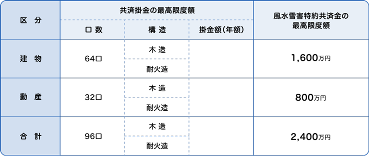 - ● 基本契約口数が建物64口、動産32口を超えない場合 : 風水雪害特約契約口数は、基本契約と同口数